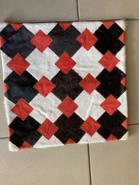 Description is Stunning cowhide cushion cover with front panel in Genuine hair on and back panel is leather with zipper.