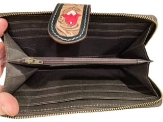 Leather and cowhide with zipper around , cowhide may varie as no 2 are the same, 8″x4.5″