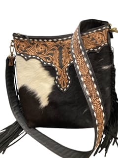 cowhide front with carved adornment.